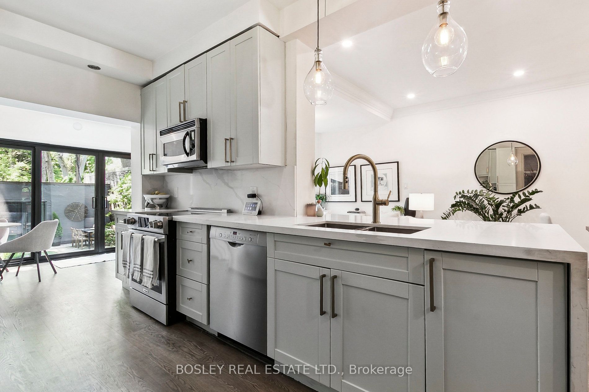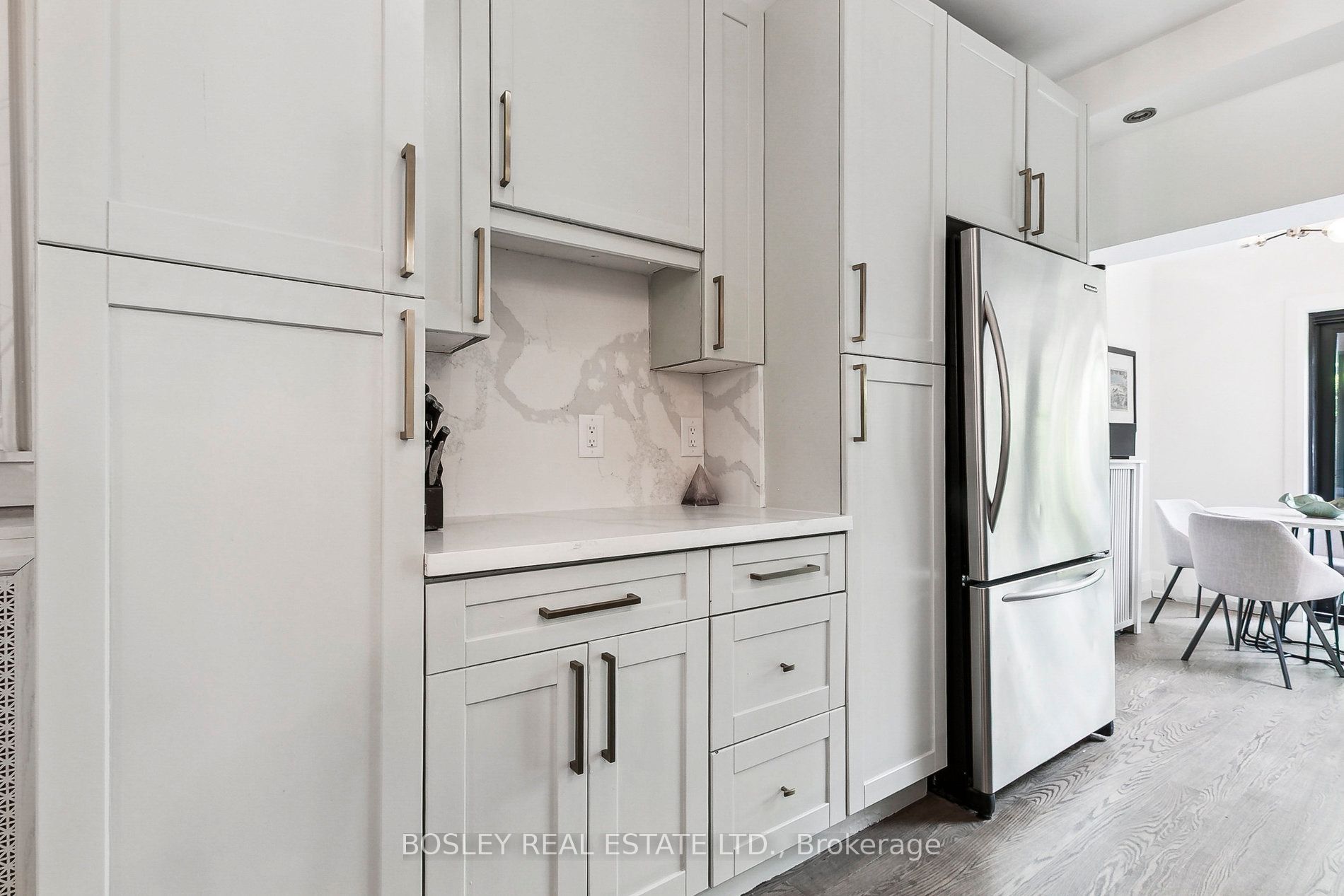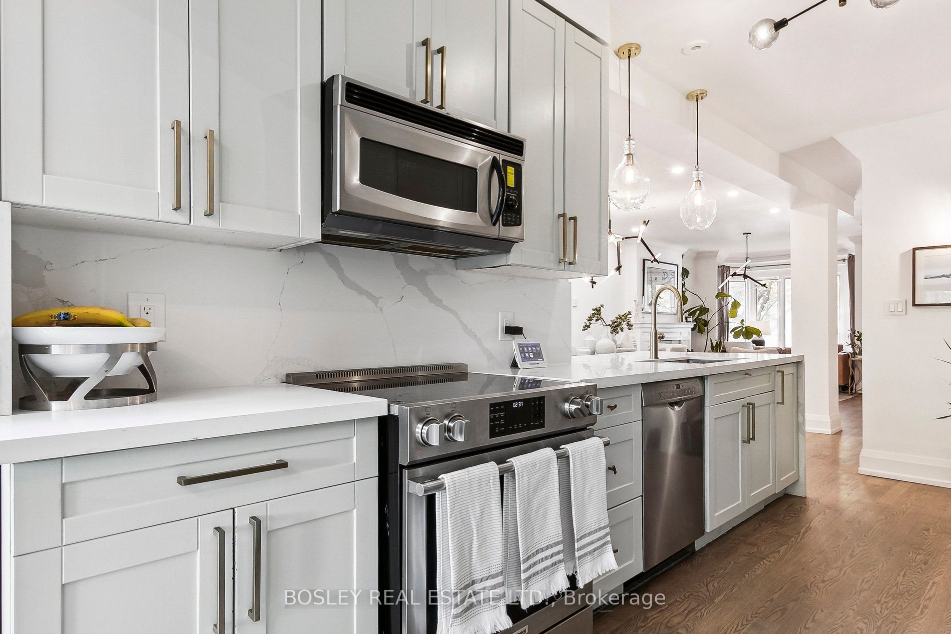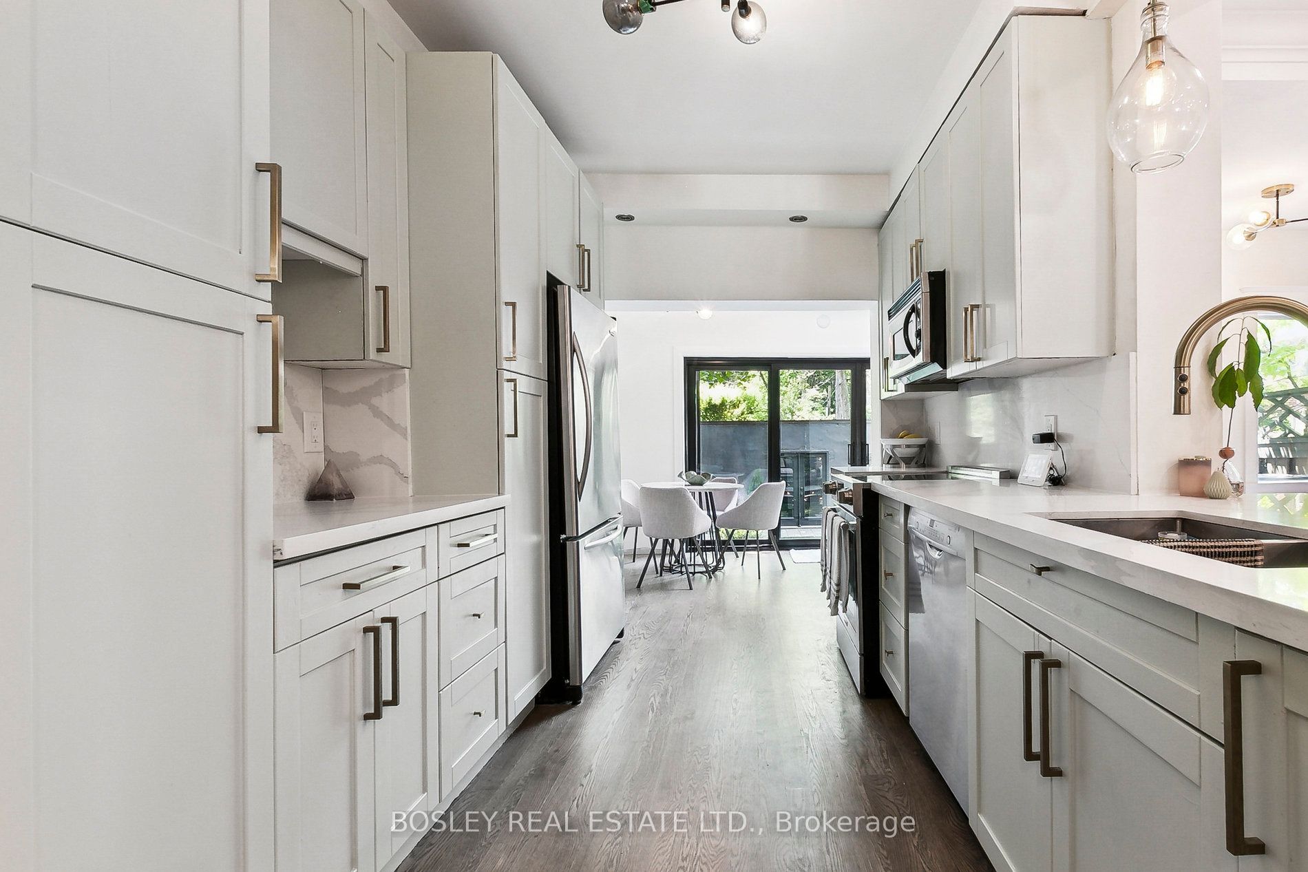 The main floor is a showstopper, with a floor-to-ceiling west-facing sliding door that leads to the backyard and bathes the open concept living and dining areas in sunlight throughout the day. Gorgeous hardwood floors run throughout, complementing the elegant wood-burning fireplace and the beautifully updated eat-in kitchen featuring stainless steel appliances, a breakfast bar, and exceptional storage.