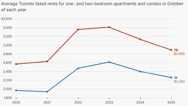 Toronto rents have dropped to a 40-month low after 21 consecutive months of annual declines — reaching their lowest point since the summer of 2022.